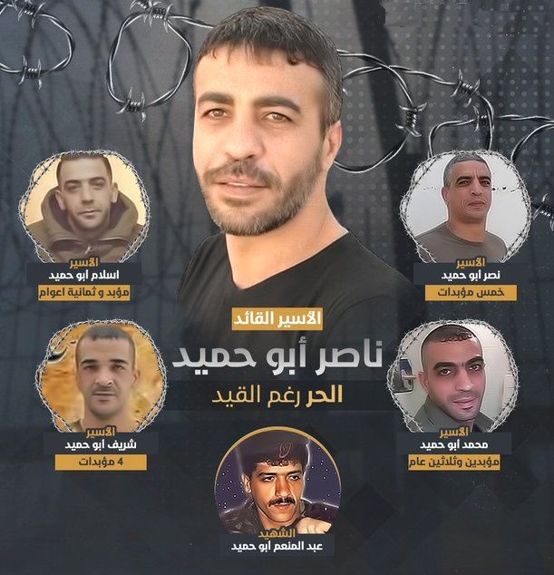 وكانت قوات الاحتلال الإسرائيلي اعتقلت ناصر أبو حميد (50 عاماً) للمرة الأولى وهو قاصر، ثم توالت الاعتقالات عدة مرات، من دون أن ينكسر أو تُثني إرادته إجراءات السجّان، ومن دون أن تتزعزع قناعاته بعدالة قضيته وحقوق شعبه، وفي كل مرة خرج فيها من السجن كان أكثر صلابة وشموخاً، وأكثر نشاطاً ودفاعاً عن وطنه وحقوق شعبه، فظل وفياً للأرض والقضية، ومقاتلاً شرساً في وجه المُحتل ومستوطنيه. ومع اندلاع انتفاضة الأقصى سنة 2000، شارك في تأسيس كتائب شهداء الأقصى التابعة لحركة "فتح"، وأصبح قائداً لها في الضفة الغربية، وقاد العديد من العمليات البطولية ضد المحتل وجنوده ومستوطنيه، وحاول الاحتلال اغتياله أكثر من مرة بعد أن تحول إلى مطارَد، إلى أن تمكنت قوات الاحتلال من اعتقاله في 22 نيسان/أبريل 2002 برفقة أخيه نصر في مخيم قلنديا للاجئين، وتعرّض لتحقيق قاسٍ، وتعذيب جسدي ونفسي، وبتاريخ 24 كانون الأول/ديسمبر من العام نفسه، أصدرت المحكمة المركزية في القدس بحقه حكماً بالسجن المؤبد المفتوح سبع مرات، بالإضافة إلى 50 عاماً أُخرى، وبعد اعتقاله أصبح من قادة الحركة الأسيرة، ومثَّل الأسرى في كثير من المواجهات مع إدارة السجون الإسرائيلية، وكان نداً، عملاً بوصية الشهيد غسان كنفاني: "لا تمت قبل أن تكون نداً". وما زال قائداً صلباً ومدافعاً قوياً عن حقوق إخوانه ورفاقه الأسرى، ونستذكر هنا كلماته بعد ثلاثين يوماً من إضراب الكرامة في سنة 2017: "ما زلنا نطرق أبواب الزنازين، نصرخ مكبّرين ومهلّلين ومتحدّين السّجان وبطشه وإجرامه الوحشي، وما زلنا نتنفس الحرية والكبرياء، نسير إلى الموت مبتسمين، ونتربع على بطانية سوداء، هي كل ما تركوه لنا، حول كأس ماء وقليل من الملح، نغني للوطن ولربيع الانتصار القادم. عن أجسادنا لا تسألوا، فلقد خانتنا وتهاوت منذ أيام، أمّا عن أرواحنا وإرادتنا فنطمئنكم أنها بخير، صامدون كما الصخر في عيبال والجليل، أقسمنا اليمين على أن نواصل حتى النصر أو الشهادة، وعاهدنا أرواح الشهداء ألّا تكون هذه المعركة إلّا شمعة انتصار نضيئها بأرواحنا وأجسادنا على درب الحرية والاستقلال".