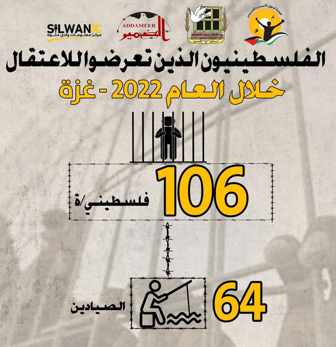 وعلى صعيد أعداد حالات الاعتقال في المحافظات الفلسطينية، بقيت القدس الأعلى ما بين المحافظات، وبلغت حالات الاعتقال قرابة (3 آلاف) حالة، فيما سجل (106) حالات اعتقال من قطاع غزة، منهم (64) حالة كانت من نصيب الصيادين، حيث لوحظ تصاعدا لافتًا في استهداف الصيادين.