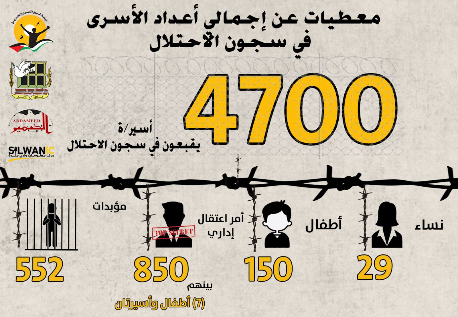 وبلغ إجمالي أعداد الأسرى في سجون الاحتلال (4700) أسير/ة يقبعون في (23) سجن ومركز توقيف وتحقيق، من بينهم (29) أسيرة يقبعنّ في سجن "الدامون"، و(150) طفلاً وقاصراً، موزعين على سجون (عوفر، ومجدو، والدامون)، وبلغ عدد المعتقلين الإداريين قرابة (850) معتقًلا إداريًا، بينهم (7) أطفال، وأسيرتان.