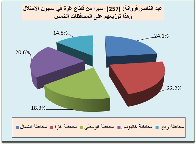 واوضح فروانة بأن هؤلاء الأسرى موزعين على محافظات القطاع الخمس، كما هو موضح في الشكل البياني المرفق، وأن محافظة الشمال هي الأعلى حيث بلغت (24.1%)، يليها محافظة غزة وتشكل ما نسبته (22.2%)، ومن ثم محافظة خانيونس (20.6%)، ومحافظة الوسطى (18.3%)، وأخيرا محافظة رفح (14.8%)،.