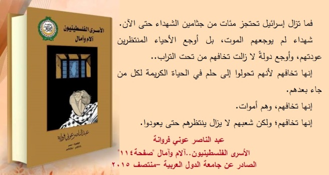وأضاف: ان احتجاز جثامين شهداء "انتفاضة القدس" لفترات متفاوتة وتعذيب ذويهم، انما يندرج في اطار سياسة ثابتة وسلوك ممنهج، فدولة الاحتلال لاتزال تخافهم حتى بعد موتهم. وتخشى من تأثيرهم، وتحريضهم للأحياء من بعدهم على مقاومة الاحتلال وظلمه، وحتى لا تتحول جنازاتهم الى تكريم لهم وتأكيد على مواصلة دربهم، فتشترط شكل وموكب الجنازات وعدد المشيعين وتوقيت الدفن، فهي تخافهم لأنهم أصبحوا نباريسُ ومشاعل لكل من بقيّ حيا من بعدهم، وتحولوا إلى حلم في الحياة الكريمة لكل من جاء بعدهم.