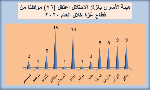 غزة-2-1-2021- رصدت هيئة شؤون الأسرى والمحررين في المحافظات الجنوبية، اعتقال سلطات الاحتلال الاسرائيلي (76) فلسطينيا من قطاع غزة خلال عام 2020، بينهم سيدة عجوز. وأن تلك الاعتقالات جرت على مدار الشهور كافة وأعلاها كانت في شهر سبتمبر الماضي الذي سُجل خلاله (15) حالة اعتقال، كما يوضح الرسم البياني المرفق.
