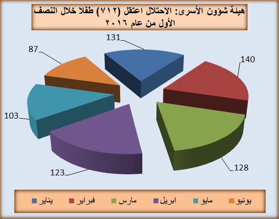 وقالت هيئة شؤون الأسرى في تقريرها أن دولة الاحتلال –وكعادتها- لم تميز في اعتقالاتها ولم تفرق في انتهاكاتها الفظة وجرائمها البشعة وإجراءاتها التعسفية، فاعتقلت الالأطفال والشيوخ والفتيات والأمهات وغيرهم من فئات وشرائح المجتمع الفلسطيني، لكن الملف كان الارتفاع اللافت في استهداف الأطفال الفلسطينيين وممن تقل أعمارهم عن الـ18 سنة، اذ سُجل خلال النصف الأول من العام 2016 اعتقال (712) طفلا قصّر تتراوح أعمارهم ما بين 11-18 سنة. وهذه تشكل زيادة كبيرة جدا تصل إلى (83.5%) عن ذات الفترة المستعرضة من العام الماضي 2015. في استهداف واضح للأطفال الفلسطينيين..