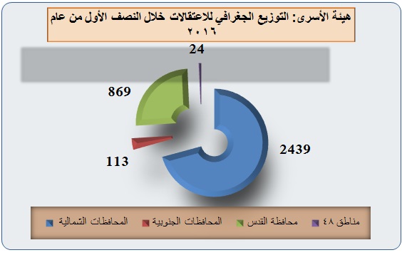 وأوضح تقرير الهيئة أن غالبية الاعتقالات خلال النصف الأول من عام 2016 كانت في محافظات الضفة الغربية حيث سُجل فيها (2439) حالة اعتقال وتشكل ما نسبته (71%) من مجموع الاعتقالات خلال الفترة المستعرضة، يليها محافظة القدس التي سُجل فيها (869) حالة اعتقال وتشكل ما نسبته (25.1%) من اجمالي الاعتقالات خلال ذات الفترة، يليها المحافظات الجنوبية حيث سُجل فيها (113) حالة اعتقال (في البحر وعلى الحدود وعبر معبر بيت حانون/إيرز حيث اعتقال مرضى ومرافقين وتجار)، كما وسجل قرابة (24) حالة اعتقال من المناطق المحتلة عام 1948.