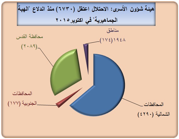 وأوضحت هيئة شؤون الأسرى في تقريرها أن حجم الاعتقالات الجماعية واتساع رقعتها الجغرافية يرفع عدد المعتقلين منذ اندلاع "الهبة الجماهيرية" في الأول من تشرين أول/أكتوبر الماضي ولغاية اليوم إلى نحو (6730) حالة اعتقال، وهذا رقم كبير وغير مسبوق. إذ لم يسجل منذ سنوات طويلة.