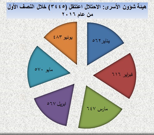 وقالت هيئة شؤون الأسرى أن حجم الاعتقالات وكافة المعطيات الإحصائية خلال النصف الأول من العام 2016، تؤكد أن نسبة الاعتقالات هذه قد شكلت زيادة كبيرة تصل إلى ما نسبته (50%) عن حجم الاعتقالات في ذات الفترة المستعرضة من العام الماضي 2015.