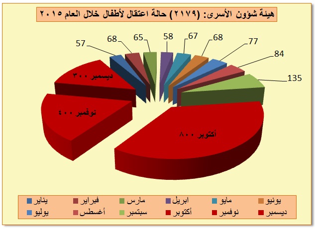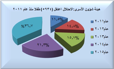 وجاء في تقرير وحدة الدراسات والتوثيق في هيئة الأسرى أن سلطات الاحتلال الإسرائيلي اعتقلت (2179) طفلا (ذكور وإناث) خلال العام 2015، وأن حالات الاعتقال تلك تفوق ثلث إجمالي اعتقالات الأطفال خلال السنوات الخمسة الماضية وتشكل ما نسبته (36.7%)، فيما أن الاعتقالات للأطفال كانت أقل خلال العام 2014 وشكلت ما نسبته (21.3%) من اجمالي الاعتقالات خلال الفترة المستعرضة. فيما أن حالات الاعتقالات خلال العام 2013 كانت أقل بكثير وشكلت ما نسبته (15.7%)، كما وكانت أقل خلال العام 2012 إذ شكلت (14.8%). أما عام 2011 فمجموع الاعتقالات التي طالت الأطفال لم تشكل سوى (11.5%) من اجمالي اعتقالات الأطفال خلال الخمس سنوات الماضية. الأمر الذي يشير وبوضوح إلى أن الخط البياني لاعتقال الأطفال يسير بارتفاع مضطرد و تصاعدي منذ العام 2011 حسب ما هو مبين أعلاه.