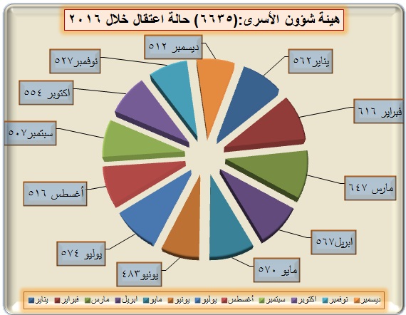 أن سلطات الاحتلال الإسرائيلي اعتقلت (6635) فلسطينيا خلال العام 2016 من كافة محافظات الوطن، فيما النسبة الأكبر من الاعتقالات والتي تُقدر بنحو (4446) حالة اعتقال وتشكل ما نسبته (67%) من اجمالي الاعتقالات، كانت من نصيب محافظات الضفة الغربية، يليها القدس المحتلة والتي سجل منها (1972) حالة اعتقال وتشكل ما نسبته(29.7%)، كما وشملت الاعتقالات(186) فلسطينيا من قطاع غزة ويشكلون ما نسبته(2.8%) ، والباقي (31) حالة اعتقال من المناطق المحتلة عام 1948. فيما اللافت أيضا أن جميع من مرّوا بتجربة الاعتقال وبنسبة (100%) كانوا قد تعرضوا لشكل أو اكثر من اشكال التعذيب الجسدي أو النفسي، أو الإيذاء المعنوي والإهانة أمام الجمهور وأفراد العائلة و الحاطة بالكرامة. الأمر الذي يشكل انتهاكا جسيما لقواعد القانون الدولي الإنساني والقانون الدولي لحقوق الإنسان.