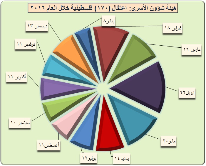 وبالأرقام وخلال رصدنا للاعتقالات والفئات العمرية من المعتقلين الفلسطينيين نجد بأن ما نسبته (80%) من الفلسطينيين الذين طالتهم الاعتقالات الإسرائيلية خلال العام 2016، كانوا من فئتي الشباب والأطفال (ذكورا واناثا).
