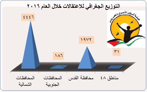 أن غالبية الاعتقالات خلال العام 2016 كانت في محافظات الضفة الغربية حيث سُجل فيها (4446) حالة اعتقال وتشكل ما نسبته (67%) من مجموع الاعتقالات خلال العام، يليها محافظة القدس التي سُجل فيها (1972) حالة اعتقال وتشكل ما نسبته (29.7%) من اجمالي الاعتقالات خلال العام نفسه، يليها المحافظات الجنوبية حيث سُجل فيها (186) حالة اعتقال (في البحر وعلى الحدود وعبر معبر بيت حانون/إيرز) وتشكل ما نسبته(2.8%)، كما وسجل قرابة (31) حالة اعتقال من المناطق المحتلة عام 1948.