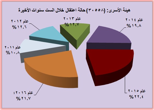 ان اجمالي حالات الاعتقال خلال الست سنوات الماضية وصلت الى (30558) حالة اعتقال، ويلاحظ أن الاعتقالات في تصاعد مستمر خلال هذه السنوات، حيث سجل خلال العام 2011 (3312) حالة اعتقال، وفي العام 2012 (3848) حالة اعتقال، وفي العام 2013 (3874) حالة اعتقال، وفي العام 2014 (6059) حالة اعتقال، وفي العام 2015 (6830) حالة اعتقال وخلال العام 2016 سجل (6635) حالة اعتقال.