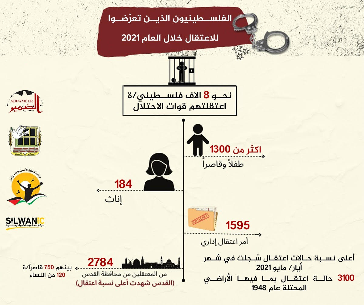 تواصل سلطات الاحتلال الإسرائيلي استخدام سياسة الاعتقالات اليومية في مواجهة نضال الفلسطينيين لانتزاع حقوقهم وحرّيتهم، ووصل معدّل الاعتقالات اليومية إلى نحو (22) حالة، وبلغت أعلى نسبة اعتقالات في شهر أيّار/ مايو 2021، إذ وصلت إلى (3100) حالة اعتقال من كافّة أنحاء فلسطين بما فيها الأراضي المحتلة عام 1948، التي سُجل فيها 2000 حالة اعتقال من بين مجموع الاعتقالات في ذاك الشهر، (علماً أن رصد الاعتقالات داخل الأراضي المحتلة عام 1948 جاء خلال شهر أيار فقط)، حيث شكّلت عمليات الاعتقال في حينه تحولاً كبيراً ليس فقط على صعيد أعداد المعتقلين، وإنما على مستوى العنف الذي رافقها. فيما سُجّلت أدنى نسبة اعتقالات في شهر آب/ أغسطس 2021، وبلغت (345) حالة اعتقال.