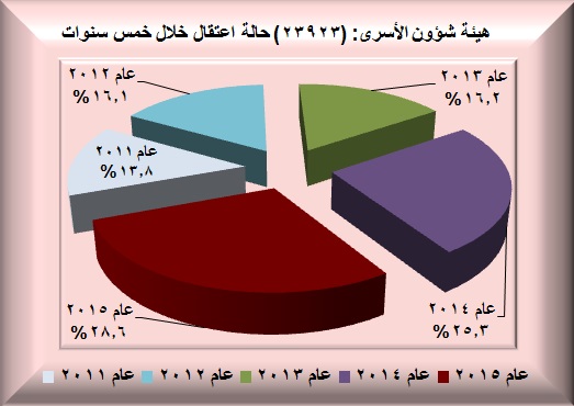 واضاف: لقد تمكنا من رصد (23923) حالة اعتقال خلال السنوات الخمس الماضية، وأن الخط البياني للاعتقالات سار بشكل متصاعد منذ العام2011، إذ أن حصيلة الاعتقالات خلال عام 2011 شكلت ما نسبته (13.8) من مجموع تلك الاعتقالات، فيما حصيلة الاعتقالات خلال عام 2012 ارتفعت لتصل الى (16.1%). وفي العام 2013 كان الارتفاع طفيفا حيث كانت حصيلة الاعتقالات (16.2%). أما خلال العام 2014، وخاصة بعد حادثة اختفاء المستوطنين الثلاثة في الخليل منتصف العام، فنسبة الاعتقالات تصاعدت بشكل كبير وشكّلت حصيلة الاعتقالات ما نسبته ( 25.3%) من مجموع الاعتقالات خلال الخمس سنوات. أما النسبة الأكبر فقد سُجلت خلال العام المنصرم 2015 والذي تصاعد فيه الاعتقالات خاصة خلال الثلاثة شهور الأخيرة من نفس العام ليشهد أعلى حصيلة اعتقالات منذ عام 2011 ووصلت ما مجموعة (28.6%) من اجمالي الاعتقالات خلال الخمس سنوات الماضية.