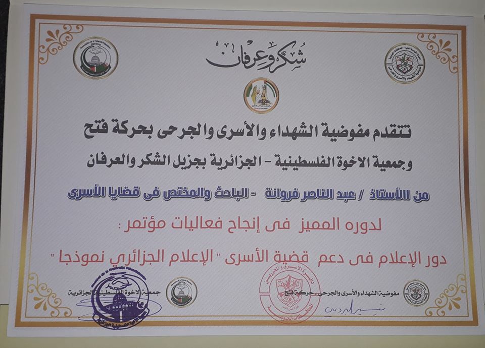 أولا- نوجه تحية احترام وتقدير إلى جمهورية الجزائر الشقيقة والحبيبة بكافة مكوناتها وتحديدا إلى شعبها ووسائل إعلامها والتي مازالت تولي لقضايا شعبنا ولقضية الأسرى مساحة واسعة وأهمية بالغة، حيث مازال هذا الاهتمام وهذه التجربة الفريدة محط احترام وتقدير بالغين من قبل شعبنا الفلسطيني وأسرانا في السجون الإسرائيلية ومحررينا ومفوضية الشهداء والأسرى والجرحى بحركة فتح وكافة الجهات الفاعلة في مجال الأسرى.