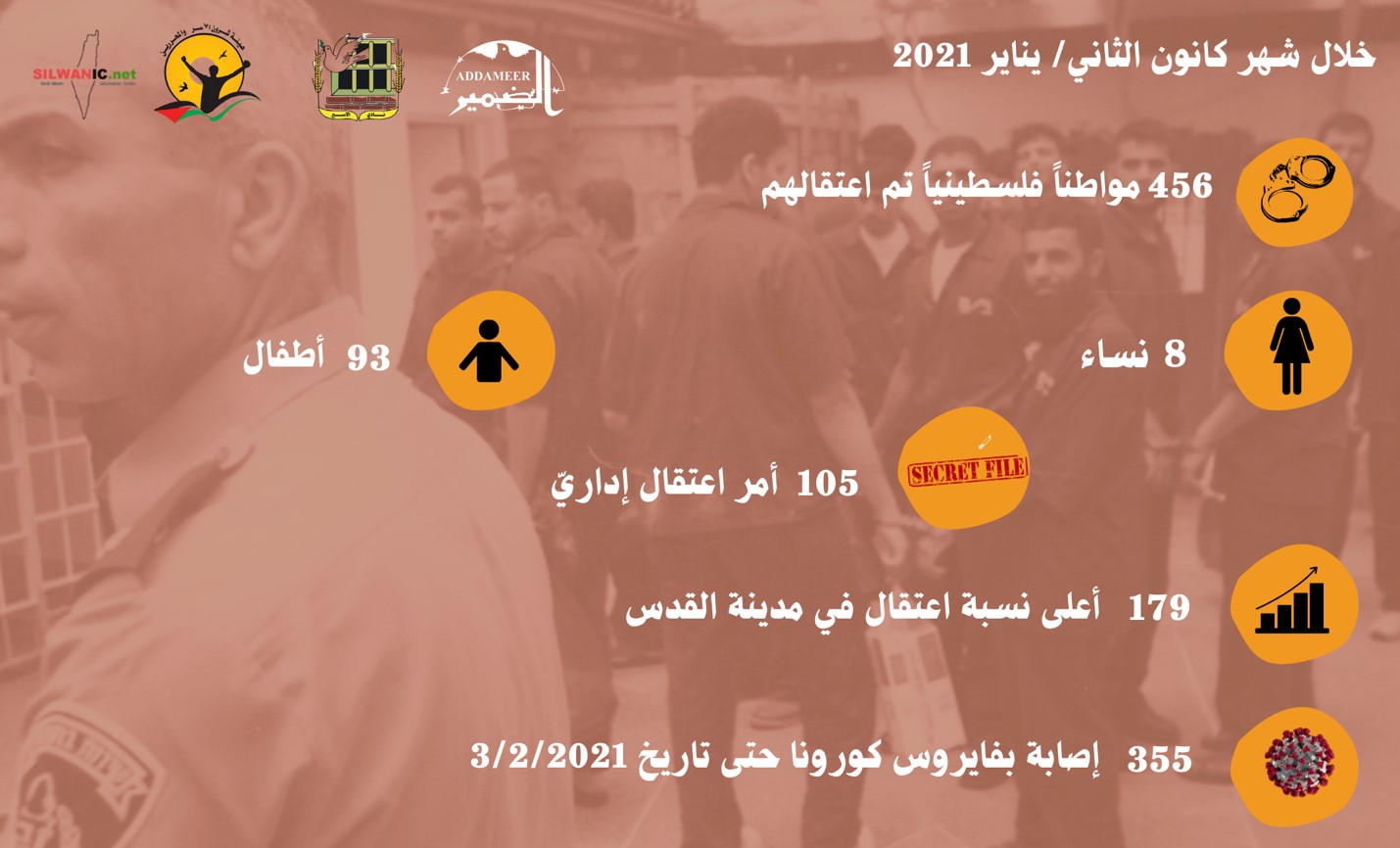 ووفقًا لمتابعة المؤسسات الحقوقية الخاصة بشؤون الأسرى، فإن قوات الاحتلال الإسرائيلي، اعتقلت، نحو (456) فلسطينياً/ة، خلال شهر كانون الثاني/ يناير 2021؛ من بينهم (93) طفلاً، و(8) من النساء، ووصل عدد أوامر الاعتقال الإداري الصادرة (105) أمر اعتقال إداري، بينها (30) أمرًا جديدًا، و(75) تجديد.